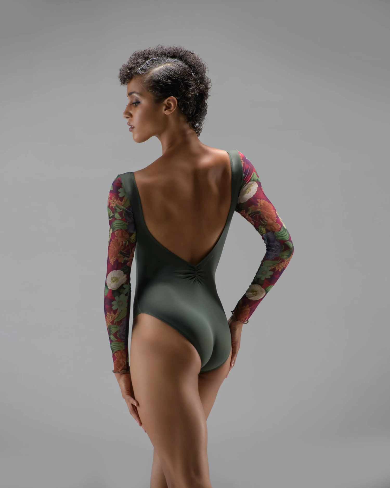 The Valentina leotard features a classic long sleeve mesh with a delicate floral design, paired with a low V back design to accentuate a flattering low back shape with your moves.