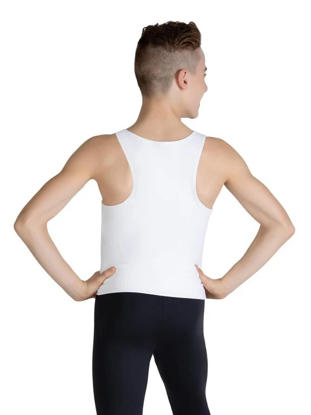 Tank featuring a tailored racerback to follow the shape of a dancer’s body.