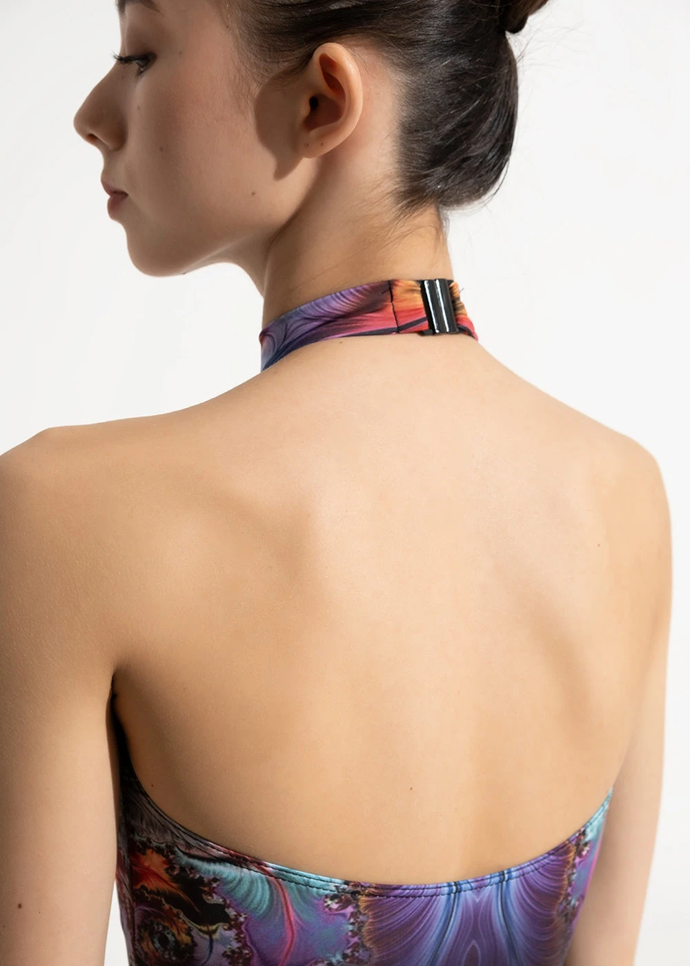 This infinitely complex design carries a secret: it never repeats itself exactly, just like dancers and artists. To be that unique, we created this mini-collection, the first of many. This sleeveless leotard has a V-neck with a small keyhole on the back with our secure clasp closure. Fully front lined and bra cup pockets.