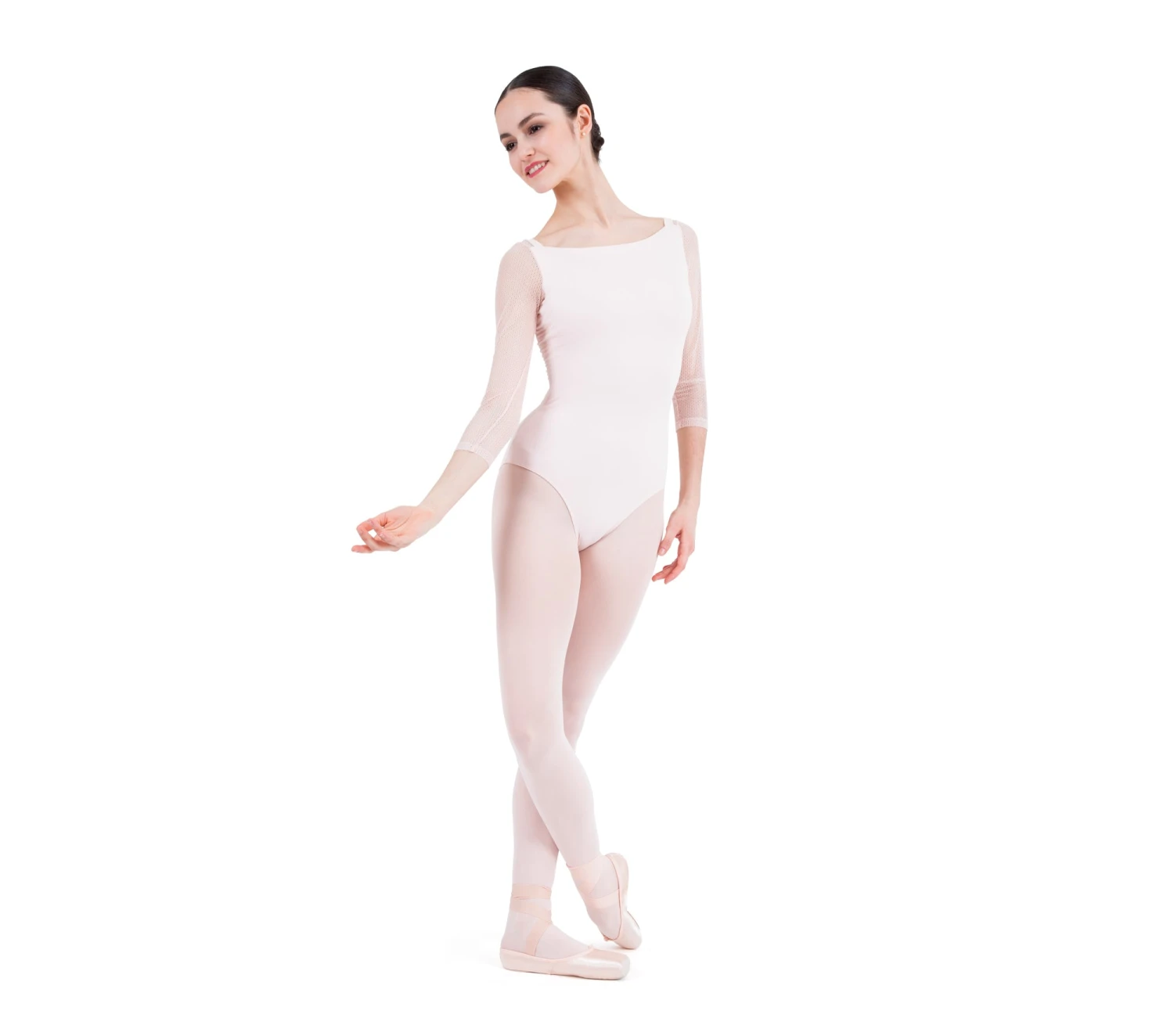 The ladies 3/4 sleeves leotard D0678 has a boat neckline in the front and a large ‘V’ neckline in the back to emphasize the dancer’s body. The fine lace on the sleeves and in the back gives elegance to the silhouette