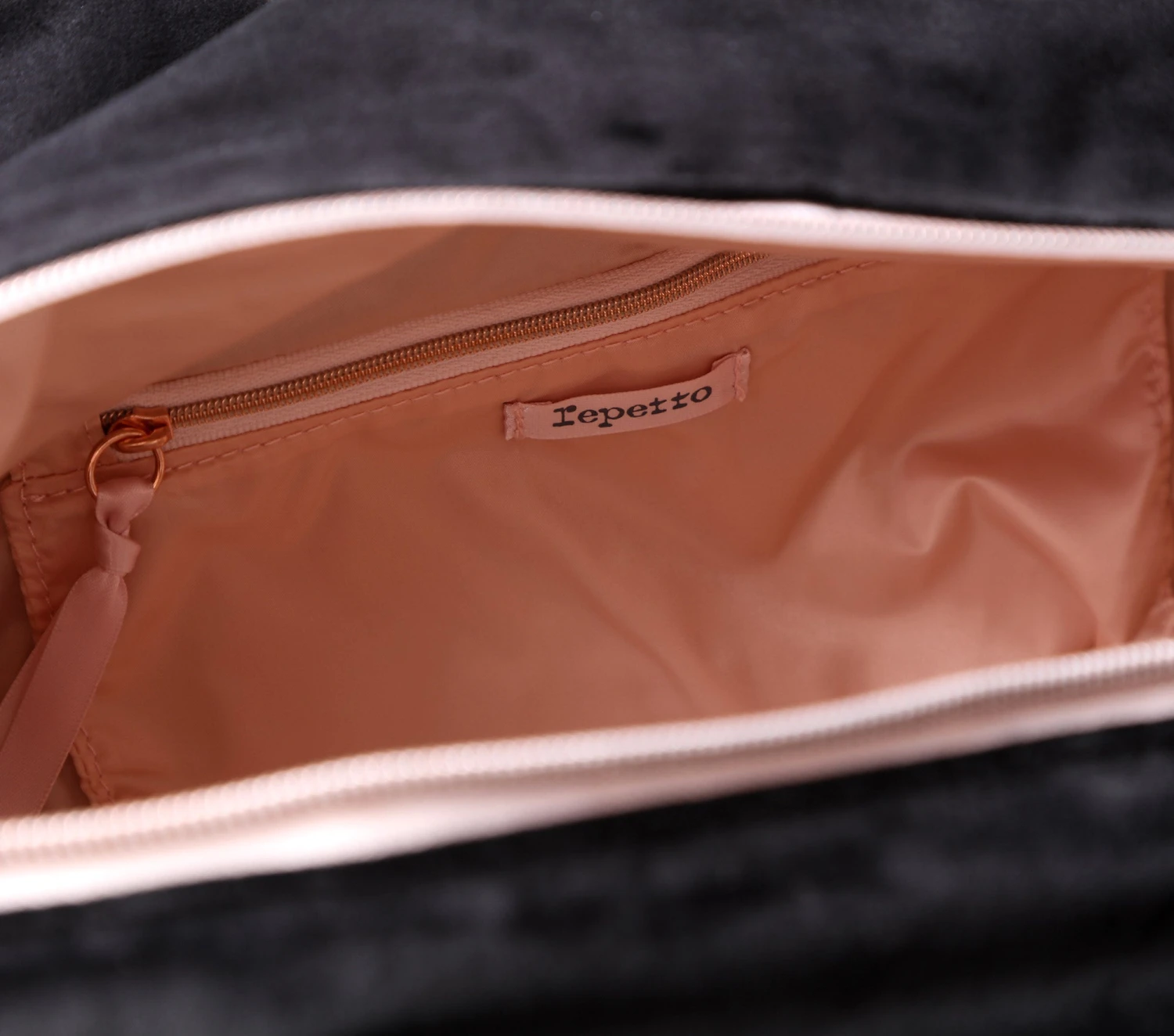Details : zip closure. One front patch pocket. One interior zipped pocket. Side knot effect. Rose gold Repetto logo. Pink nylon lining.