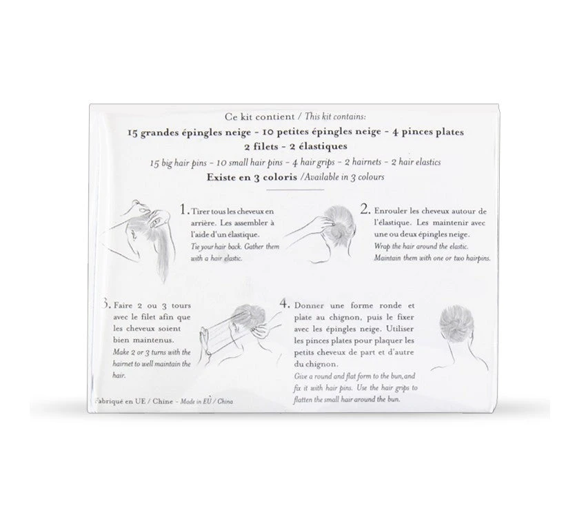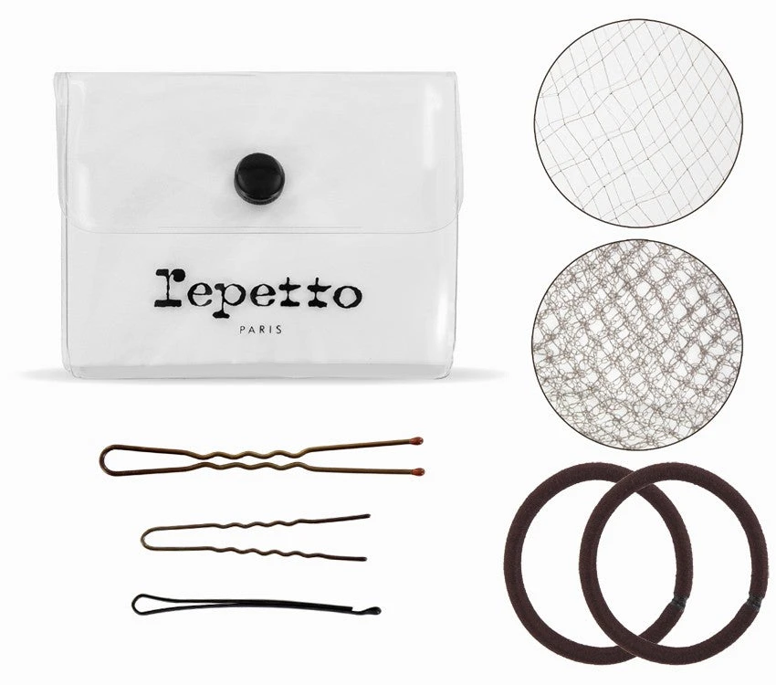 Brown hair kit for dance buns containing two bun nets, 15 snow clips of 6.8 cm, 10 snow clips of 5 cm, 4 flat clips of 5 cm and 2 hair bands. Repetto Paris plastic pouch packaging with explanatory note inside.
