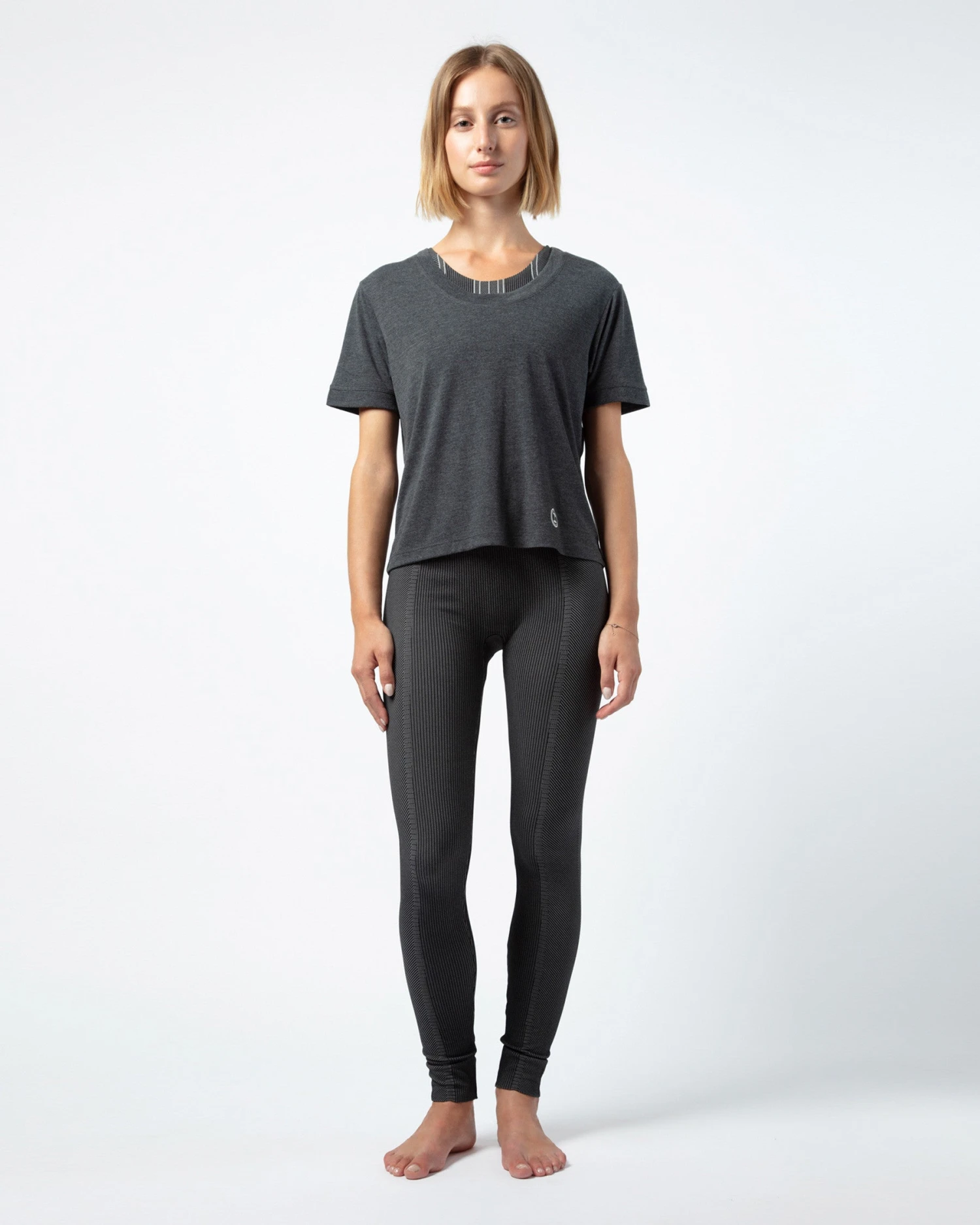 Details: short sleeves. Round scoop neckline in rib. Short and fitted shape. White reflective transfer of circle R.