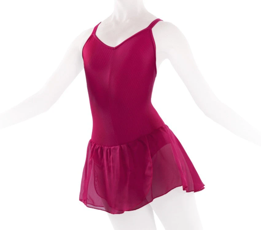 Girls tunic with double straps and a V front neckline. Its chevron ribbed fabric brings fantasy to the product while giving a well-shaped aspect to the leotard. The cross-over chiffon frill gives a glimpse of the movements. Available in adult size and in many colours this is a perfect product for the different levels of dance schools. Seam in the middle front. Front lining.