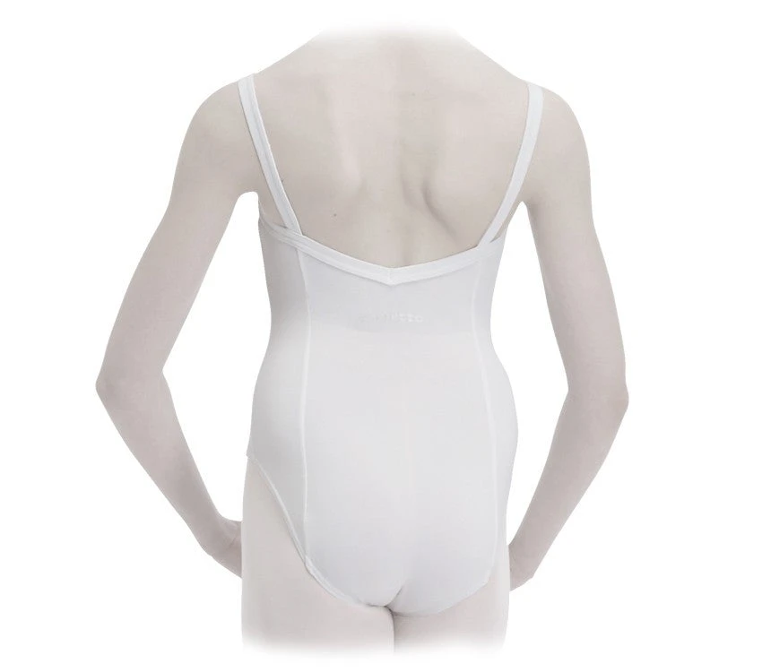 Girl’s leotard with spaghetti straps, with a wide neck trim for a good maintain. The gathered neckline is adjustable with a small inner ribbon in satin. Front and back V-neckline. The princess seams emphasize the curves of the dancer. This style is lined in the front. Available in adult size and in many colours, this is an ideal product for major schools and conservatory dancing classes. Transparent transfer of the Repetto logo on the back. Mat aspect.
