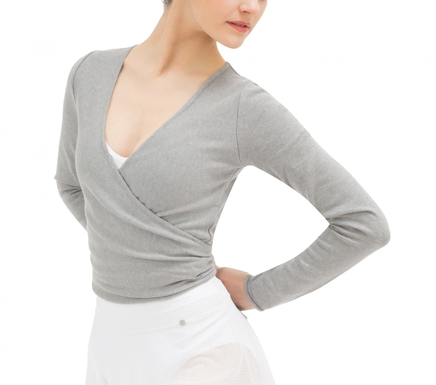 Mouse-gray long-sleeved wrap-over, long panels for different wear. R logo in tone-on-tone jacquard on the top of the sleeve. The dance collection outfits are made from our know-how developed since 1947.