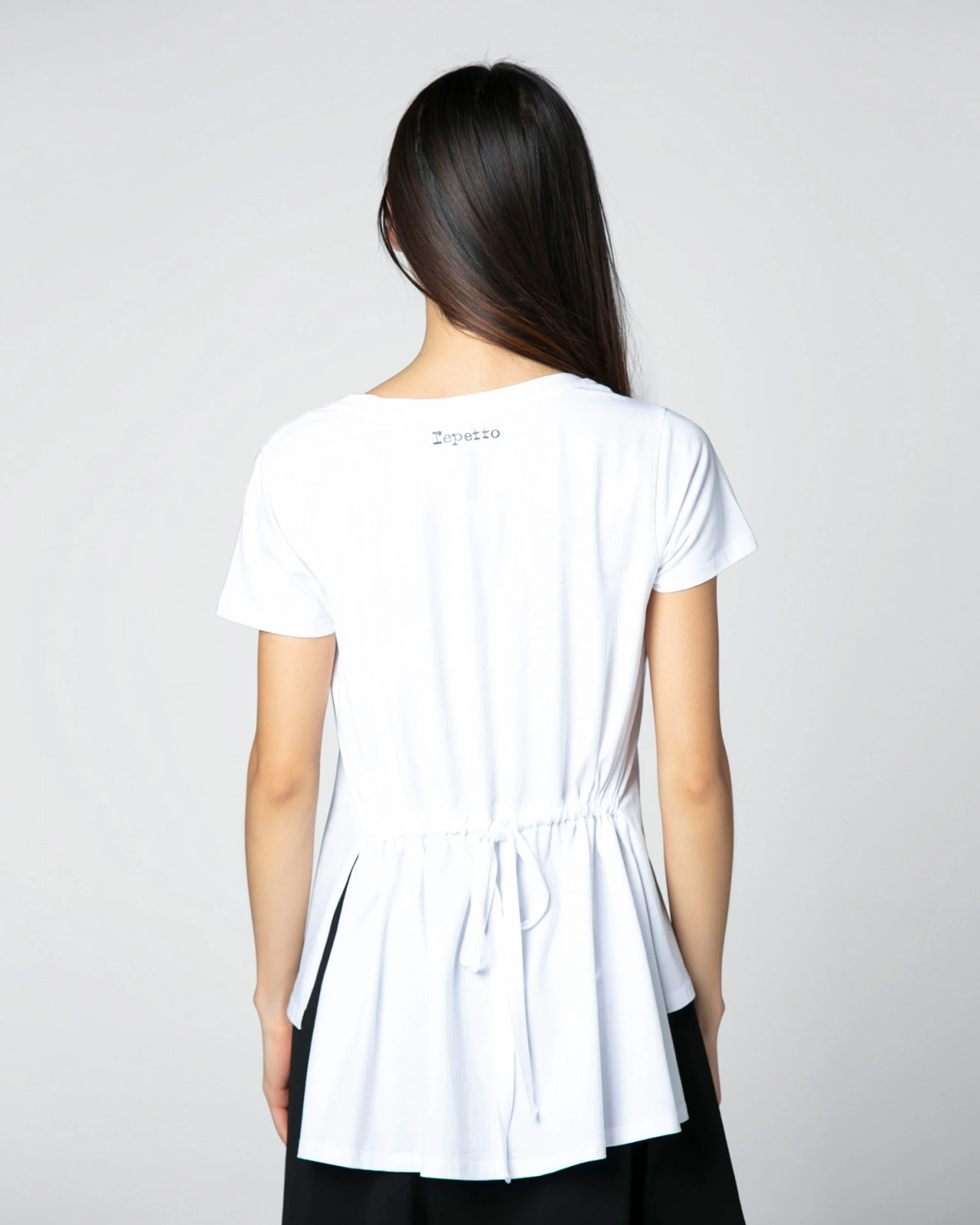 Details : rounded neckline. Short sleeves. Long and loose size. Adjustment link at the back. Silver Repetto logo on the back.