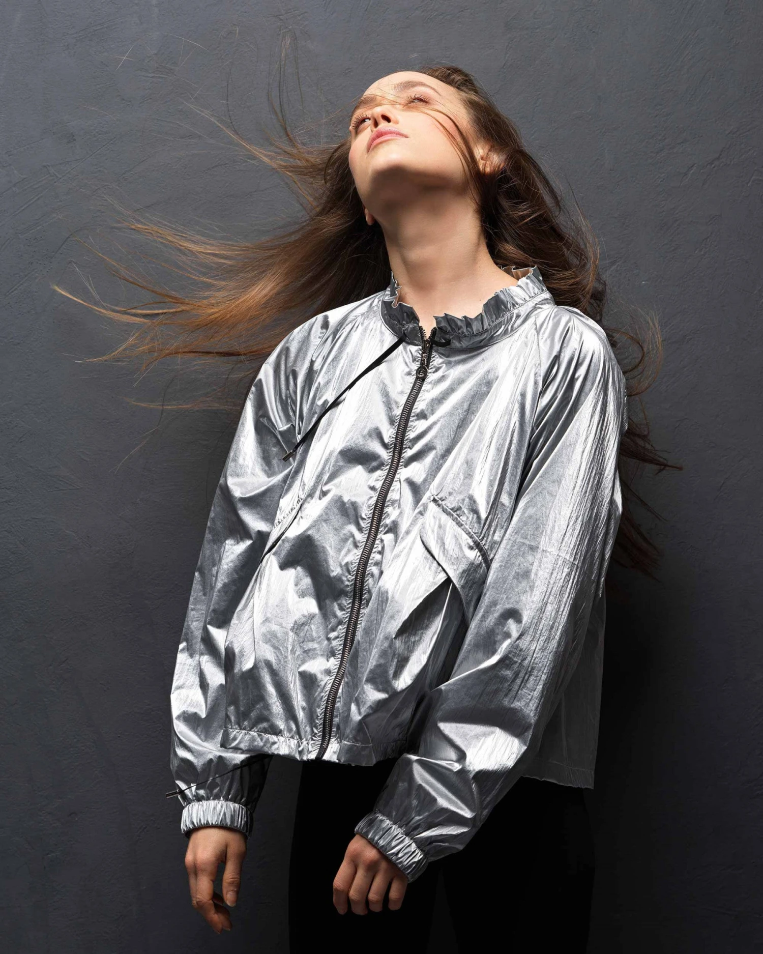 Details : zipped jacket. Long sleeves. Ruched high collar. Two front pockets. Tightening ties at the collar and at the waist. Transfer of the black Repetto logo.