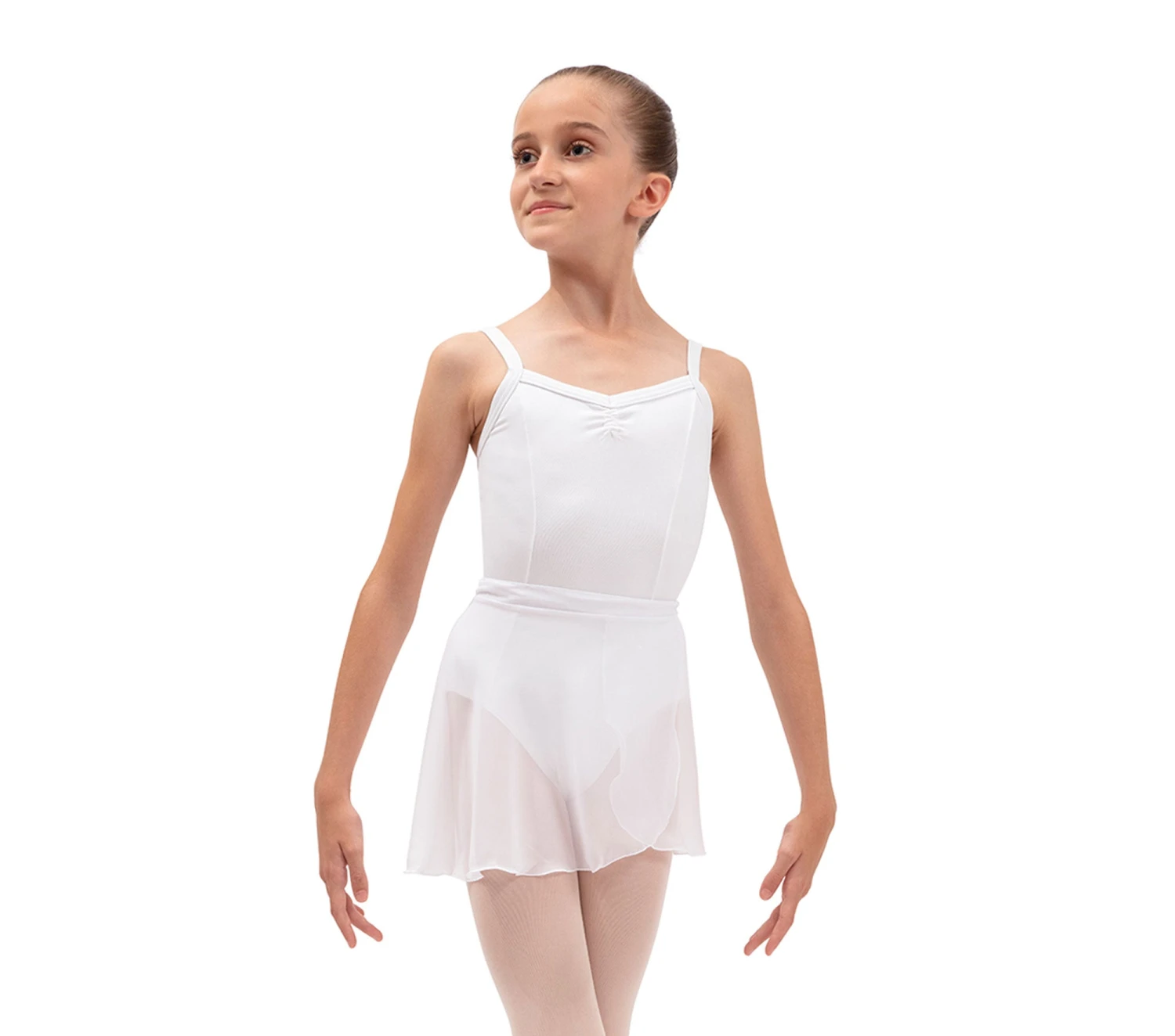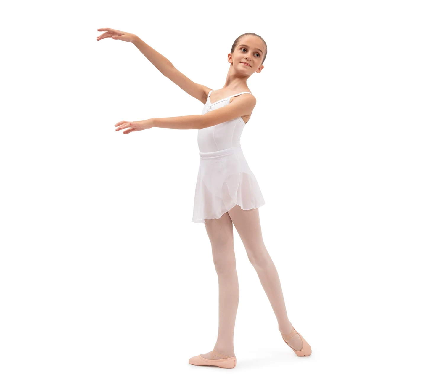 The little girl’s skirt accompanies the dancer’s outfit. It is worn above a leotard, crossed or tied edge to edge on the side using the ties. The semi-opaque muslin suggests the placement of the hips and the work of the legs. Colors coordinated with Repetto leotards. Transparent transfer of the Repetto logo on the front.