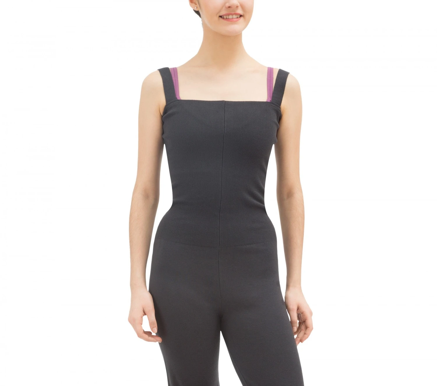 Anthracite gray jumpsuit wide straps. Bust and lower leg tightened by ribbing. Logo jacquard R tone on tone on the leg.
